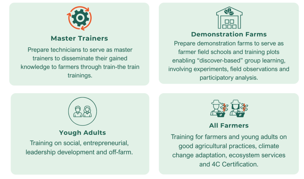 - 104 in-person group trainings with more than 400 participants have been conducted to support coffee growers in improving agricultural practices and techniques for processing coffee as well as their entrepreneurial skills and increase their knowledge on the 4C certification.