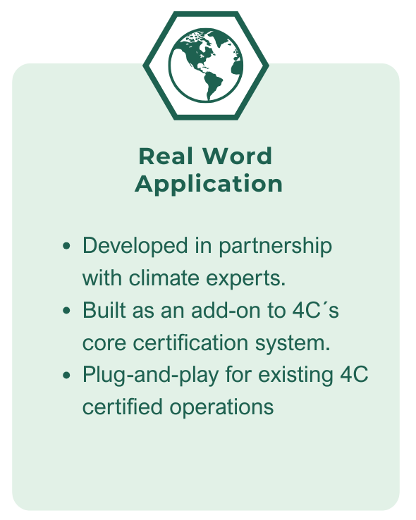 4C calculates greenhouse gas (GHG) emissions across the entire coffee supply chain, supports mitigation planning, and monitors emission reductions. A dedicated Improvement Plan tracks the performance of 4C Units and farmers in reducing emissions. Verified carbon footprint results are used for the 4C Carbon Footprint Add-On certification.